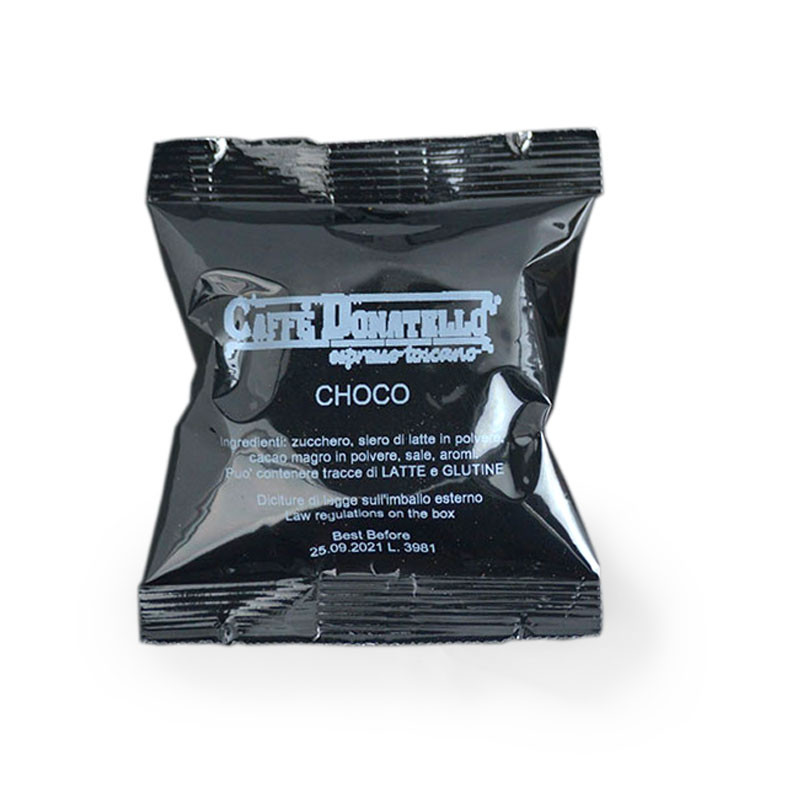 Bevanda al gusto di cioccolato in capsule monodose da 9 grammi confezionate singolarmente.